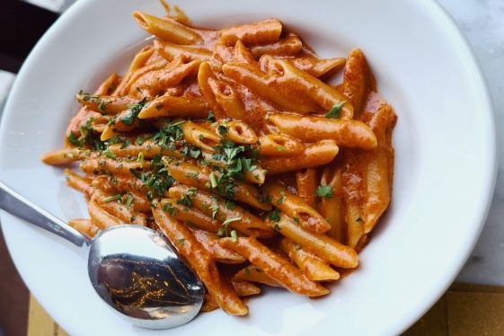 I hear the words penne alla vodka and immediately I’m 12 years old again, sitting in the booth of my family’s favorite suburban Italian-American restaurant, a tacky trompe d’oeil “frescoed” ceiling overhead, wood paneled-walls all around, and the smell of fresh-baked ciabatta-style dinner rolls wafting through the air. The plaster columns by the do...