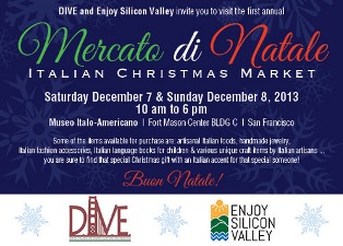 The first annual edition of Mercato di Natale (Italian Christmas Market) will be held in San Francisco on December 7th and 8th from 10am to 6pm, in collaboration with DIVE (Donne Italiane che Vivono all'Estero), a dynamic group of Italian women expats living in the San Francisco Bay Area and Enjoy Silicon Valley, a local community for European expats living in Silicon Valley.