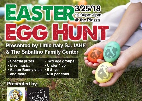 Come out and enjoy an old fashion Easter Egg Hunt in the Piazza in Little Italy San Jose! There will be 2 age groups. Children will receive their own Easter basket to go hunting for hidden eggs. Live music by David Biagini! Traditional Italian Easter Pupa con l'uova - $12 and Handmade Chocolate Eggs . There will even be a visity from the Easter Bunny!!! We hope to see you there!