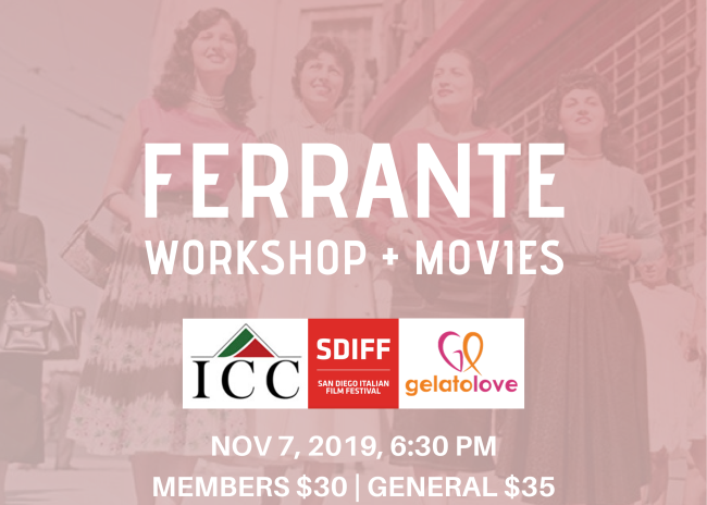 Join members of ICC and SDIFF for a night revolving around the world of Elena Ferrante. SDIFF Executive Director Diana Agostini and SDIFF Artistic Director Antonio Iannotta will hold a workshop on Elena Ferrante's first two novels: L'amore molesto and I giorni dell'abbandono. The workshop will be taught in English, with references to the original texts.