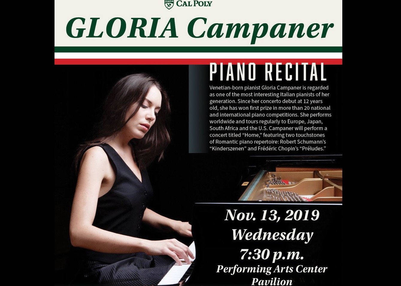 Venetian-born pianist Gloria Campaner will perform on Wednesday, November 13, 2019 at 7:30 PM at Cal Poly's Performing Arts Center Pavilion.