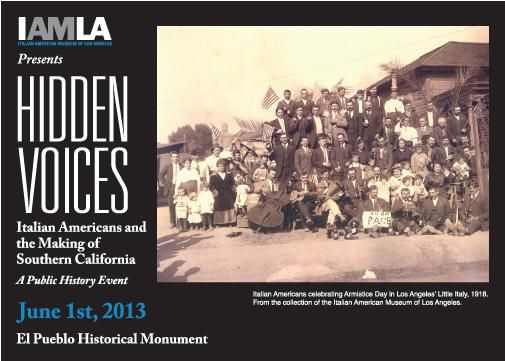 The Italian American Museum of Los Angeles (IAMLA) aims to raise awareness of this important history through Hidden Voices: Italian Americans and the Making of Southern California, a public history event that takes place on June 1st at El Pueblo Historical Monument in downtown Los Angeles, in what was the heart of the city's little Italy. Hidden Voices will include a history conference featuring presentations by four noteworthy scholars: Dr. Joanne Ruvoli (UCLA), Dr. Kenneth Scambray (University of LaVerne), Daniel Gardner (UCLA) and IAMLA executive director and historian Marianna Gatto. The event will also include a performance by MusicAntica, showcasing the music of Southern Italy's oral tradition, and lastly, educational workshops for youth.