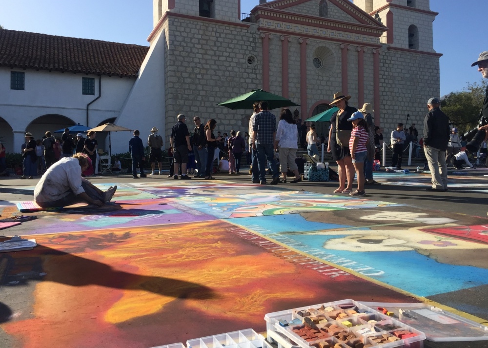 Thousands of spectators strolled along the Santa Barbara Mission’s plaza Sunday to watch artists at work during the free I Madonnari Italian Street Painting Festival, which runs through Monday. Roughly 140 large-scale images are being drawn with pastel chalk, and they stretch across the pavement in front of the mission.