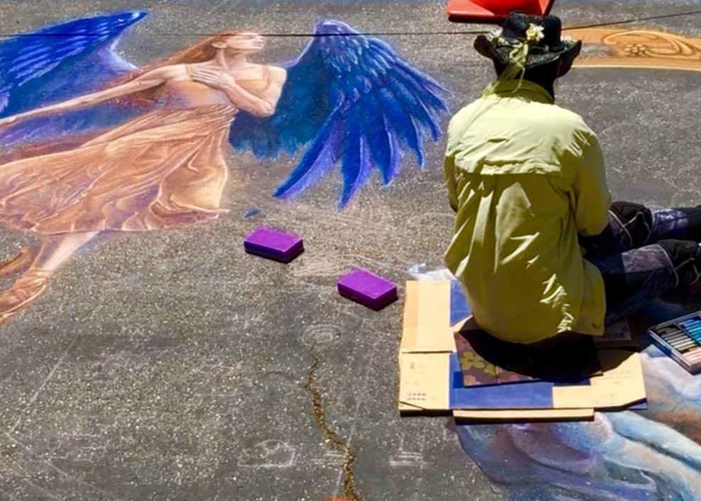 Carefully crafting on their hands and knees, artists are making images appear on the asphalt in front of the historic Santa Barbara Mission for the annual I MadonnariStreet Painting Festival. Featured Artist Sharyn Chan sat in the centerpiece location leaning into her work and saying, "this is the first chalk festival in the nation. It's the mother festival of the United States."