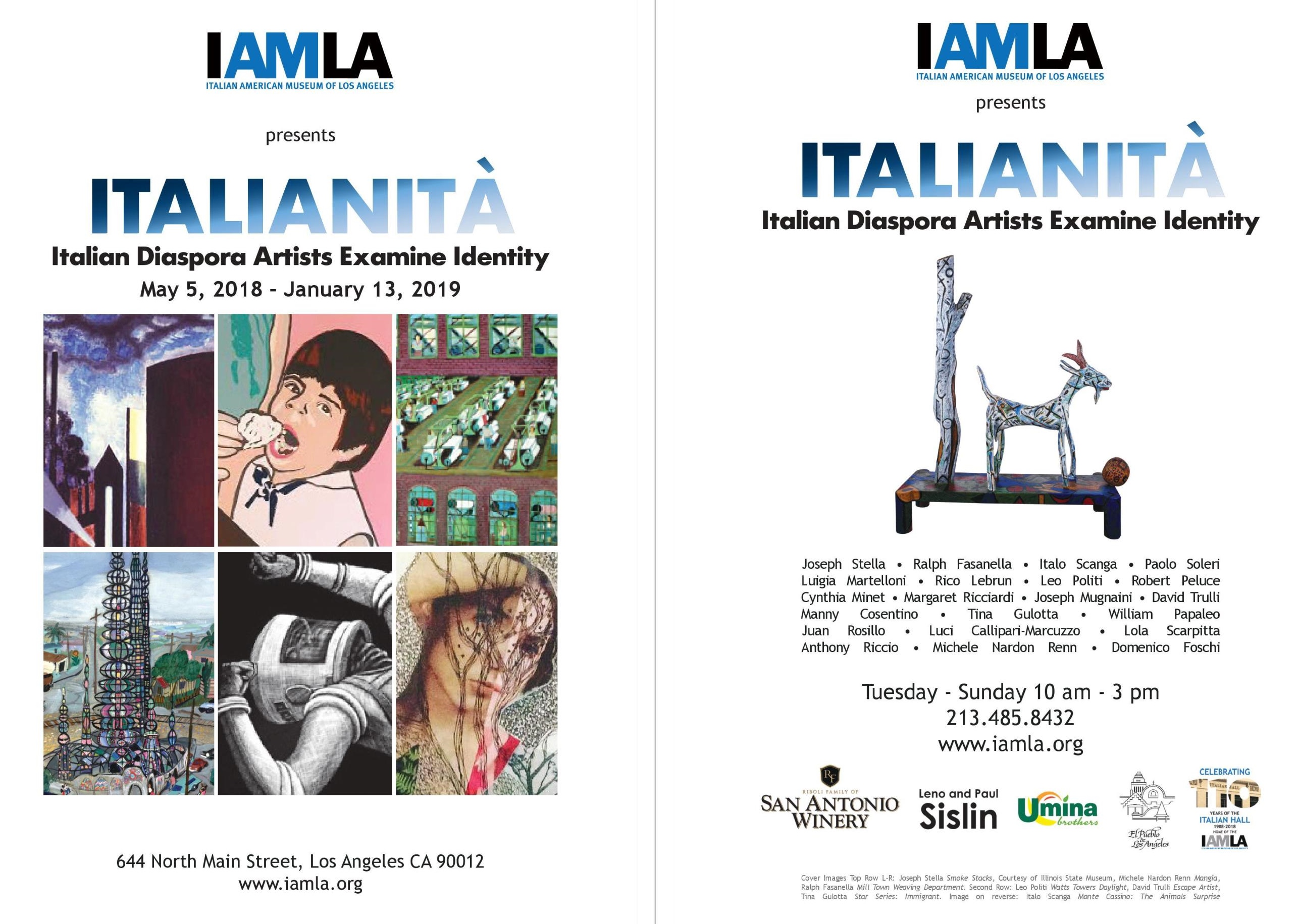 The Italian American Museum of Los Angeles (IAMLA) is pleased to present a collective exhibition “ITALIANITÀ: Italian Diaspora Artists Examine Identity.” The exhibition features celebrated artists Joseph Stella, Ralph Fasanella, Italo Scanga, Leo Politi, Paolo Soleri, Luigia Martelloni, Cynthia Minet, and Robert Peluce, among others.