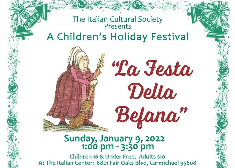 At the Italian Center (6821 Fair Oaks Blvd Carmichael, California) on January 9, 2022. The center will open at 1:00pm. Come early and enjoy free children's crafts and Befana photo booth. Masks required for all guests over age 3. Each January, the Italian Cultural Society holds a children’s Festival, “La Festa della Befana” for the children of the Italian community of Sacramento.