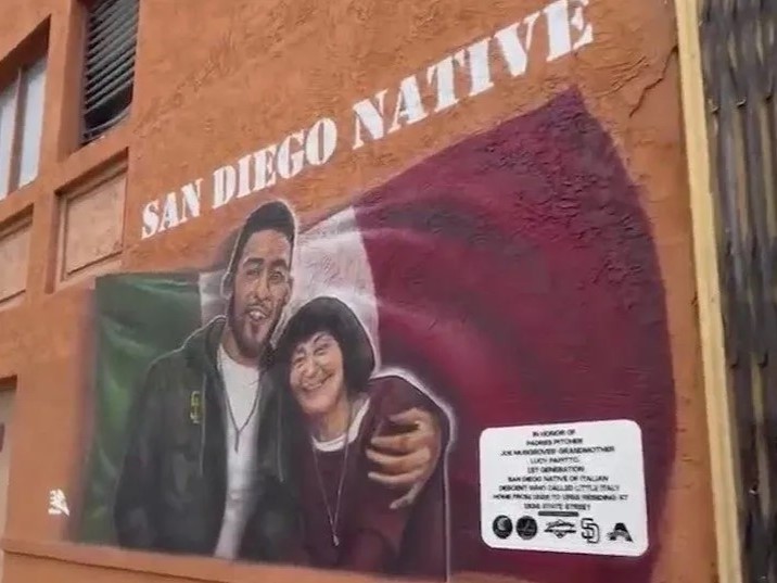 Did you know that San Diego Padres star pitcher Joe Musgrove has a family connection to Little Italy? His grandmother, Lucy Papitto, resided in San Diego’s Little Italy neighborhood for 30 years! I didn’t know this until I saw a relatively new mural and plaque today. The beautiful mural can be found on India Street a little south of Grape Street.