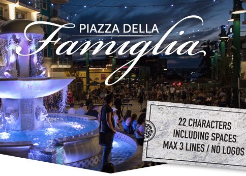 The Family Tiles are located at the base of the fountain and seating steps located near the Little Italy Food Hall.  With only 51 Family Tiles available, they will go quickly—reserve yours today by clicking on the button below. Space is limited and we will sell out! Reserve yours today FAMILY TILE SPECIFICATIONS. 4" tall x 8" wide. 22 characters max including spaces, 3 lines max and no logos. $1,000