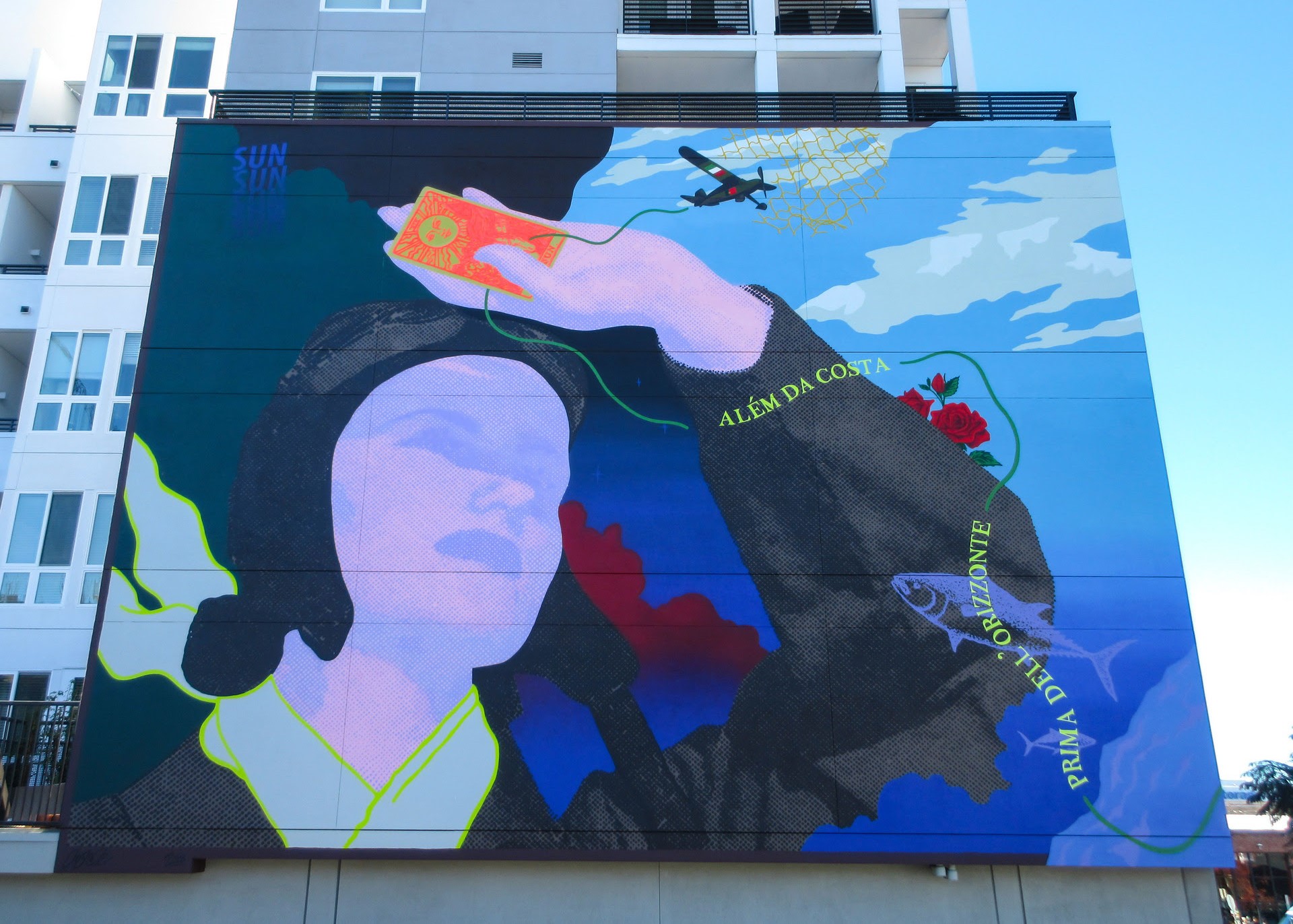 The motif of the sun is repeated throughout the mural, emphasizing the sun as a primary component and symbol of the San Diego climate and lifestyle. The figure holds an antique Italian tarot card of the sun, a card which portends good fortune, happiness, joy, and harmony. The yellow fishing net also acts as a surrogate sun, and the repetitive “SUN” text echoes the sun’s force in local culture. - CYRCLE.