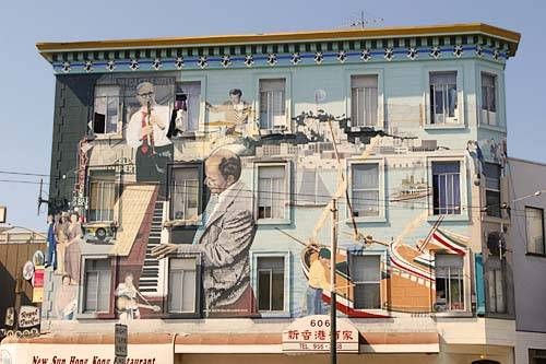 The images above on the Italian Heritage Mural are part of the life work of Italian immigrant Gino Sbrana, who started his American life in San Francisco as a vegetable peddler. By 1911, he had launched a large photographic studio, Pisa Foto, at Columbus and Broadway in San Francisco. Later Gino founded a studio in Oakland and, in 1919, settled in San Jose. Not content to confine his artistry to the formally posed studio portrait, he traveled over the Bay Area countryside with his large wooden field camera, using soft light on the shady side of barns or under large oaks to capture his fellow countrymen. Gino posed them in the coastal mist with machetes poised to harvest cauliflower, perched atop their brand new motorcycles, assembled by trucks loaded with produce from the fields, sleeves rolled up and holding their "vino".