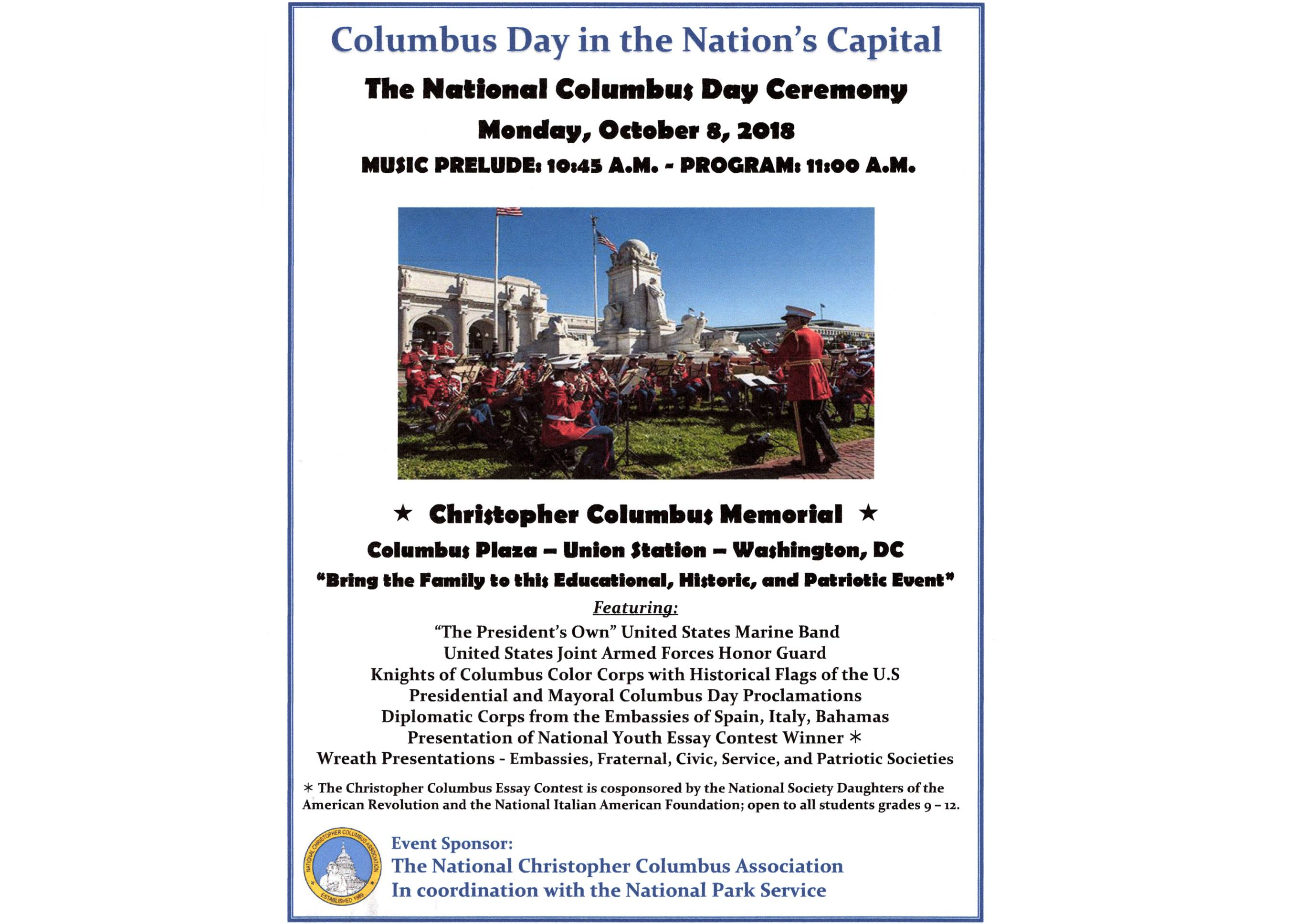 The 2018 National Columbus Day Ceremony will be held on Monday, October 8, 2018, at the Christopher Columbus Memorial Plaza across from the Union Station. The festivities will begin at 10:45 am with music from “The President’s Own” United States Marine Band.
