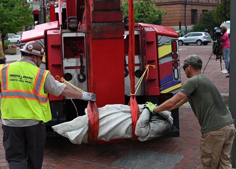 What’s left of Baltimore’s Christopher Columbus was lifted out of the Inner Harbor Monday morning as officials continued to debate the monument’s merits days after protesters pulled it over, dragged pieces of it to the water and tossed them in with no immediate response from police. Private crews with Specialty Underwater Services and Iacoboni Site Specialists lifted the pieces of the statue out of the water around 8:30 a.m.