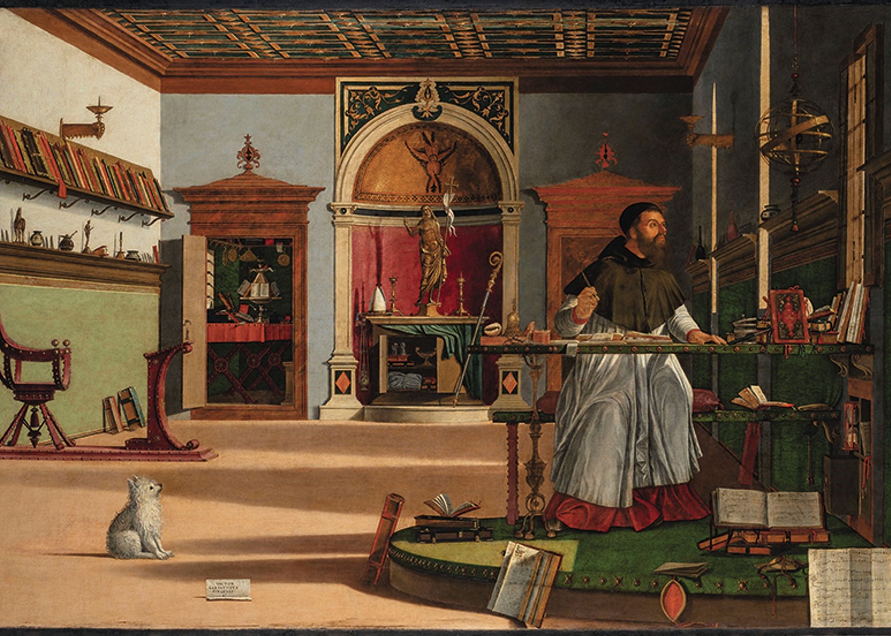 A wistful pilgrim sits on a marble step in the right foreground of Vittore Carpaccio’s Ordination of St. Stephen (around 1511). Turning to gaze at the picture’s protagonist, he is below the consecrating hand of St. Peter himself. Stephen heads a ritual formation of youthful aspirants to the office of deacon, all of them wearing sumptuous dalmatics of luminous embroidered silk, or red velvet in the case of the proto-deacon and proto-martyr.