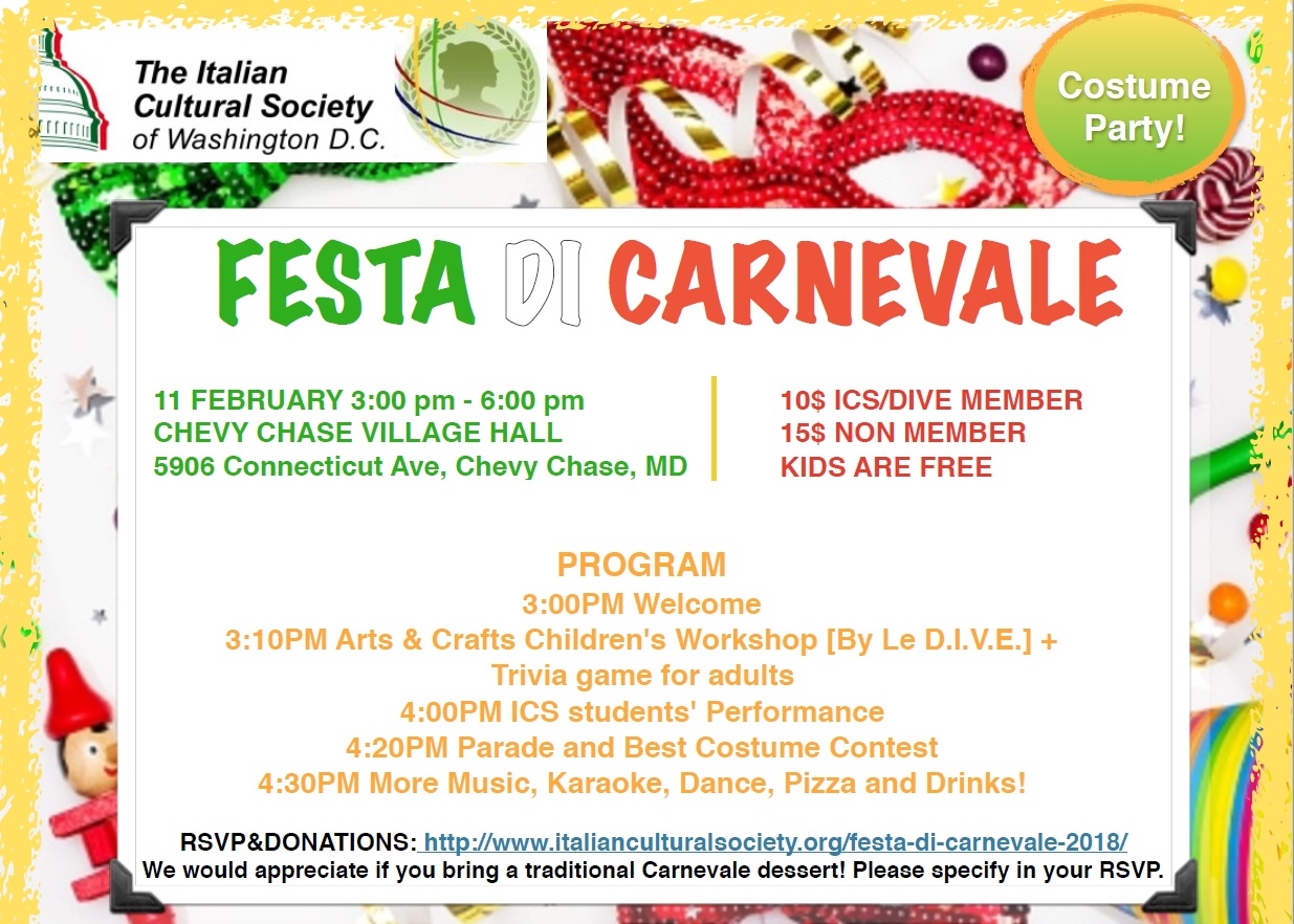 The Italian Cultural Society of Washington DC in collaboration with LE D.I.V.E. presents Festa di Carnevale 2018! Get dressed in your favorite costume and join us on February 11th, from 3:00 to 6:00 pm at the Chevy Chase Village Hall (5906 Connecticut Avenue, Chevy Chase, MD 20815), to enjoy a very special Carnival party! To RSVP please Submit the Form and pay with the Donate button in this page