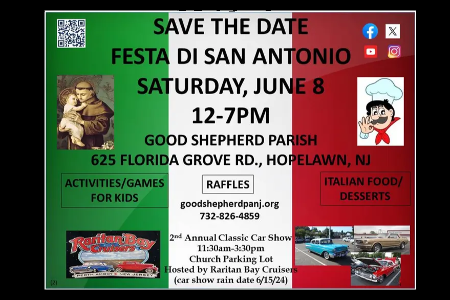 The day will include Italian food and desserts (eat in/take out), raffles, activities and games for children and more. Elevator service is available. In addition, a classic car show presented by the Raritan Bay Cruisers will be taking place in the church parking lot from 11:30am-3:30pm (rain date for car show is 6/15/24).