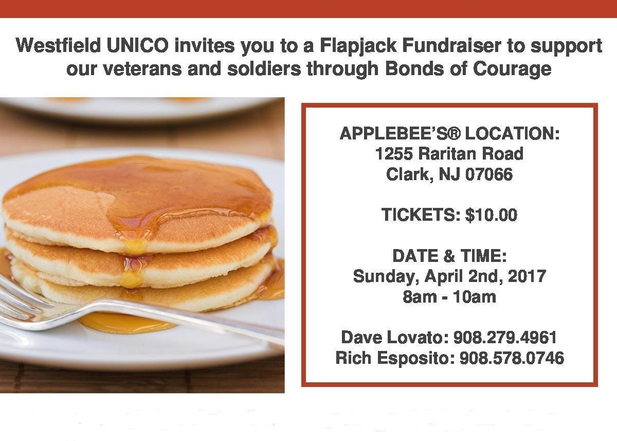 UNICO of Westfield is proud to sponsor a Flapjack Fundraiser to benefit our veterans and active military through Bonds of Courage. Bonds of Courage is a non-profit public charity that provides a network of support services to troops, veterans and military families. The services provided include job, health, family and finances.