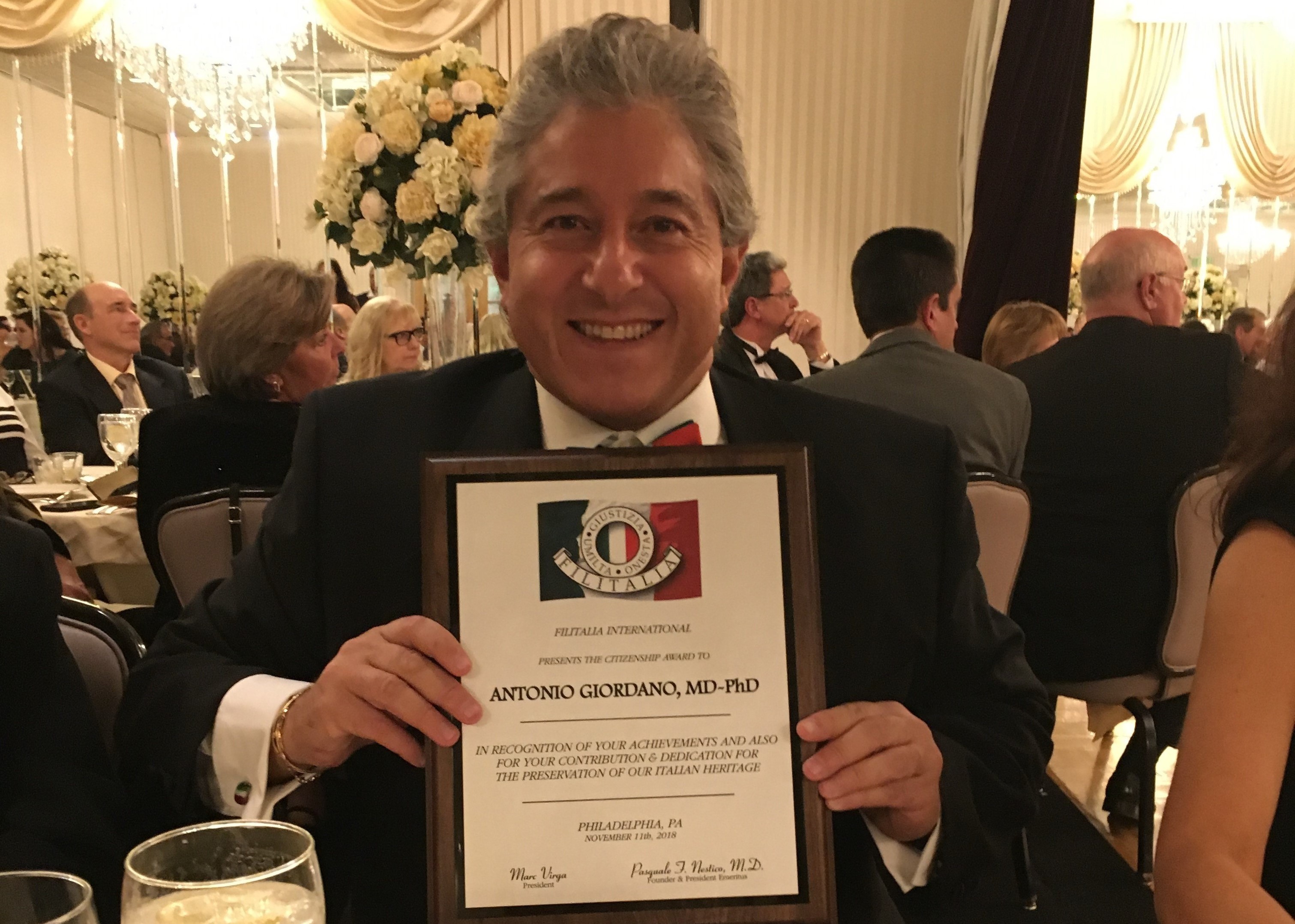 Italian-American Foundation, Filitalia, honors Antonio Giordano, MD, PhD, Founder & President of Sbarro Health Research Organization at Temple University with the Humanitarian award at the foundation’s 31st Anniversary Gala. Filitalia International & Foundation celebrates 31 years of commitment, dedication and service at their Annual Gala Dinner on Sunday, November 11, 2018. The foundation and its donors have contributed to initiatives championed by the Italian American community in the Greater Philadelphia area, among them the opening of the History of Italian Immigration Museum in 2014.