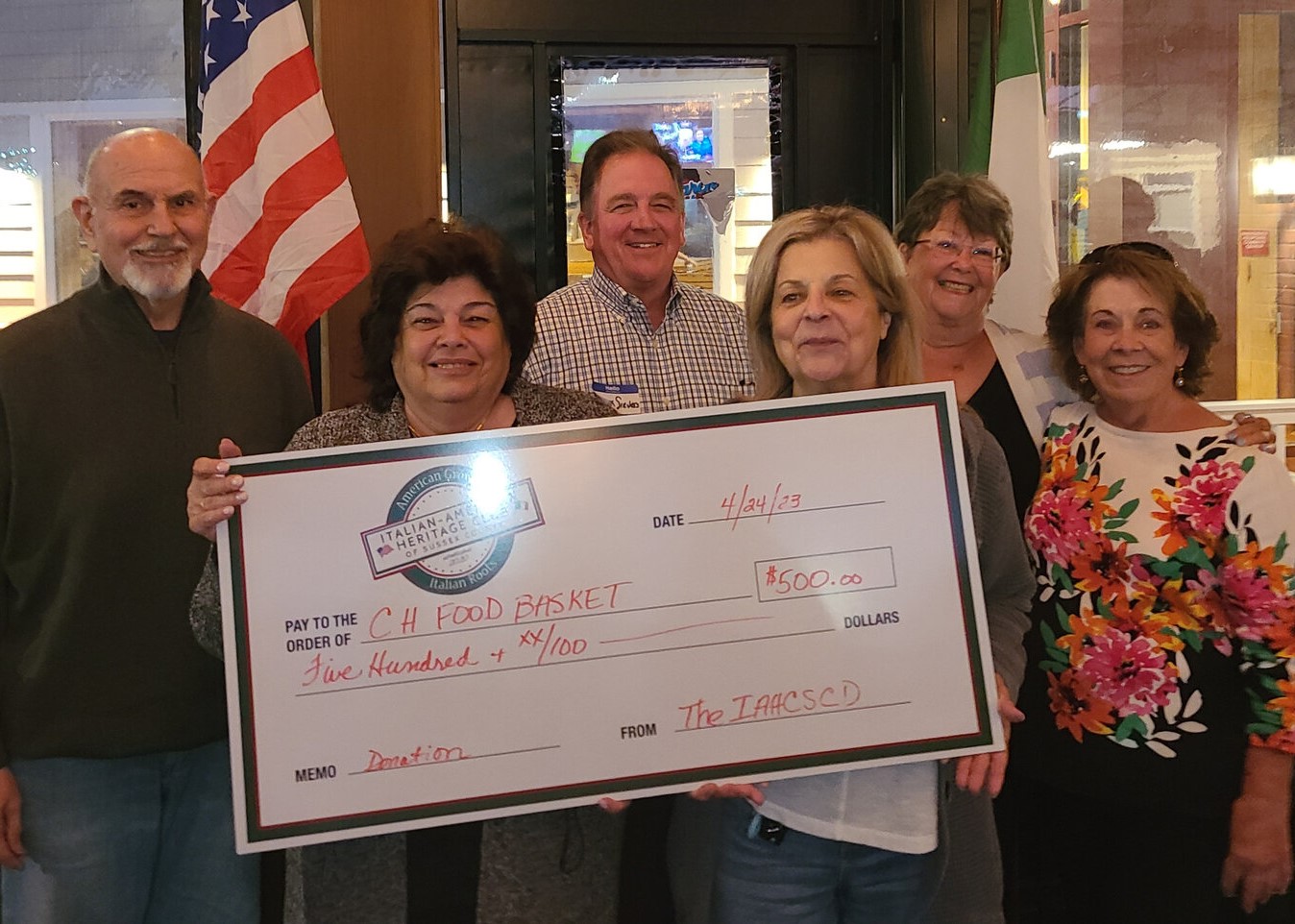 The Italian American Heritage Club of Sussex County Delaware presented the Cape Henlopen Food Basket with a $500 donation, along with food donations from club members. Mark Sievers, vice president of the Cape Henlopen Food Basket, was guest speaker at a recent club dinner and explained the organization’s purpose is to provide food to Delaware individuals and families in need.