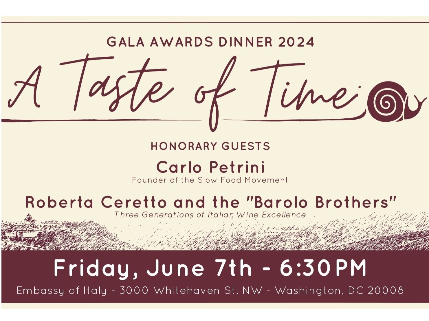 The Italian Cultural Society (ICS), a nonprofit organization that promotes the appreciation and knowledge of Italian Language and Culture, will host “A Taste of Time”, a fundraising Gala at the Embassy of Italy on June 7, 2024. At the event, the ICS will honor Carlo Petrini, founder of the groundbreaking, international Slow Food movement, and Roberta Ceretto, of Ceretto Wineries.