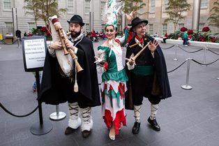 Over 2500 visitors enjoyed the Italian Holiday Festival at the Smithsonian American Art Museum in Washington DC on Saturday December 13, 2014. The beautiful Kogod courtyard was abuzz with the magic of traditional Italian performances and activities. "The Italian Fairy" entertained young visitors. Opera-Pop performed favorite songs. The Teatro Tascabile Di Bergamo stilt dancers amazed the crowd, and the Zampognari di Philadelphia (Italian bagpipe players) played traditional Italian holiday songs.