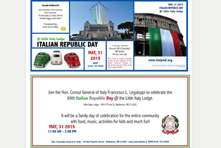 Join the Hon. Consul General of Italy Francesco L. Legaluppi to celebrate the 69th Italian Republic Day @ the Little Italy Lodge. Little Italy Lodge - 905E Pratt St, Baltimore, MD 21202.