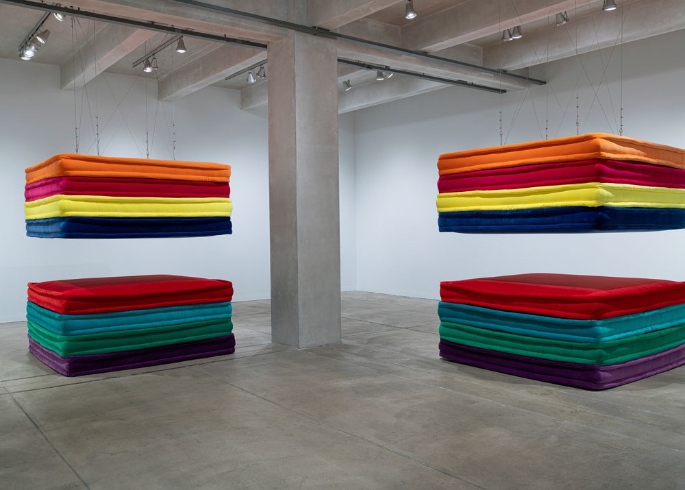 There’s a new, zen-like space at The Andy Warhol Museum. The first things you’ll notice in the gallery are stacks of colorful mattresses hanging above one another. The work, “Milano,” was produced in collaboration with More-So, a division of Italian design company Moroso, and you’re invited to slip on some shoe coverings and hop inside.