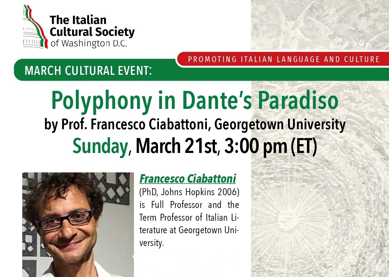 On the occasion of the 700th anniversary of Dante’s death, The Italian Cultural Society is pleased to host Prof. Francesco Ciabattoni from Georgetown University. Join us for our March Cultural Event: Polyphony in Dante’s Paradiso. Sunday, March 21st, 3:00 pm (ET), on Zoom. The event is in anticipation of the Dantedì, March 25th, the official day dedicated to the sommo poeta in Italy and in the world.