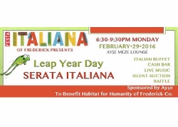 www.festaitalianafrederick.com What better way to celebrate Leap Year Day than joining us on February 29th from 6:30 pm to 9:30 pm at Ayse Meze Lounge for a fabulous Italian night! Enjoy live music, savor delicious Italian food, visit with friends, mingle with guests, bid at our silent auction, try your luck with our raffle, and much more. Serata Italiana is an exciting way to support Habitat for Humanity of Frederick County, MD.