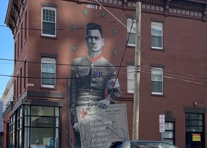 On Thursday, November 3, 2022, The City of Jersey City and Office of Cultural Affairs honored World War I Veteran, Sgt. Vincent Pantozzi with a street dedication and mural. Sgt. Pantozzi Plaza was dedicated next to the three story mural of Vincent Pantozzi by Jersey City Mural Arts Program artist, David Sami.