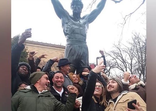 "When the students first arrived at the museum, they went to the statue and somebody said, 'Hey, you just missed Sylvester Stallone,'" said CATHS Principal Edgard Nieves in a statement. "Nobody believed he was there, and then two black SUVs pulled up." None other than Rocky himself, Mr. Sylvester Stallone, jumped out of one of the vans and ran through the excited gaggle of students and jumped up on the statue.