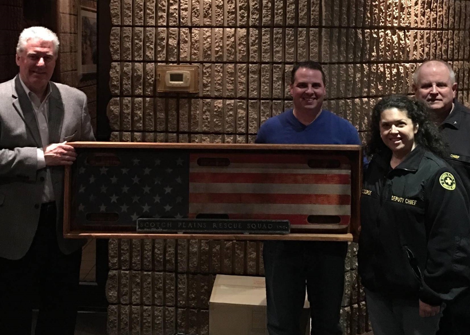 At its annual meeting on Tuesday, March 28, UNICO, the Italian American service organization, made a special donation to the Scotch Plains Rescue Squad #scotchplainsrescuesquad at Giovanna's in Plainfield. The flag artwork was created by Ernie Hernandez in honor of the squad's 80th anniversary this year. Hernandez, a recently retired Scotch Plains police officer, served on the Rescue Squad for decades. He created the piece from old wooden backboard from one of the squad's original ambulances.