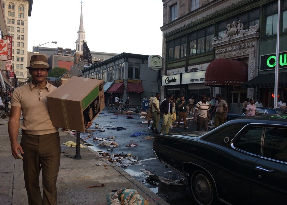 Filmmakers converged on Newark to stage a riot. Debris covered the street — overturned chairs, soggy newspapers, dismembered mannequins and clothes from ransacked storefronts. On Tuesday afternoon, extras waited for their turn in the spotlight, including black actors wearing button-down shirts, slacks and summer dresses, and white actors dressed as Newark police officers and National Guardsmen. Patrol cars were stationed throughout the scene. At the abrupt pop of a gunshot that evening, actors scattered in all directions. Two men moved a TV down the street. Another man wearing a fedora carried a box for a General Electric automatic skillet.