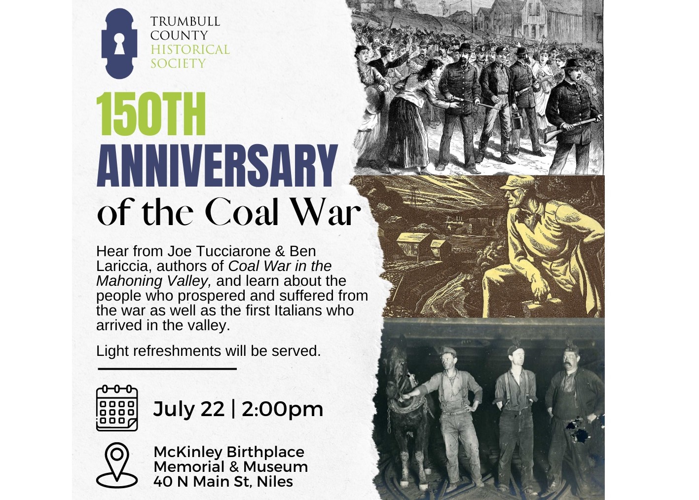 Saturday July 22. 2:00 pm - 3:30 pm. McKinley Memorial Museum - 40 N Main St, Niles, OH. Event is FREE and open to the public! Join us in a showing of a short documentary outlining the history of the 1873 Coal War that saw 7,500 miners in Hubbard and Liberty Townships strike and brought the first Italian immigrants to the area.
