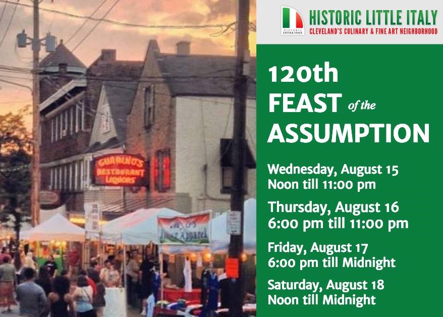 August 15 noon to August 18 midnight EDT. Little Italy Village (12021 Mayfield Road), Cleveland, Ohio USA. The parish of Holy Rosary Church in Cleveland's Little Italy is ready to host the 120th Annual Feast of the Assumption starting Wednesday, August 15th, through Saturday, August 18th. The Festival is a celebration of the Catholic Holy Day, August 15th, which commemorates the Blessed Virgin Mary being taken into heaven.