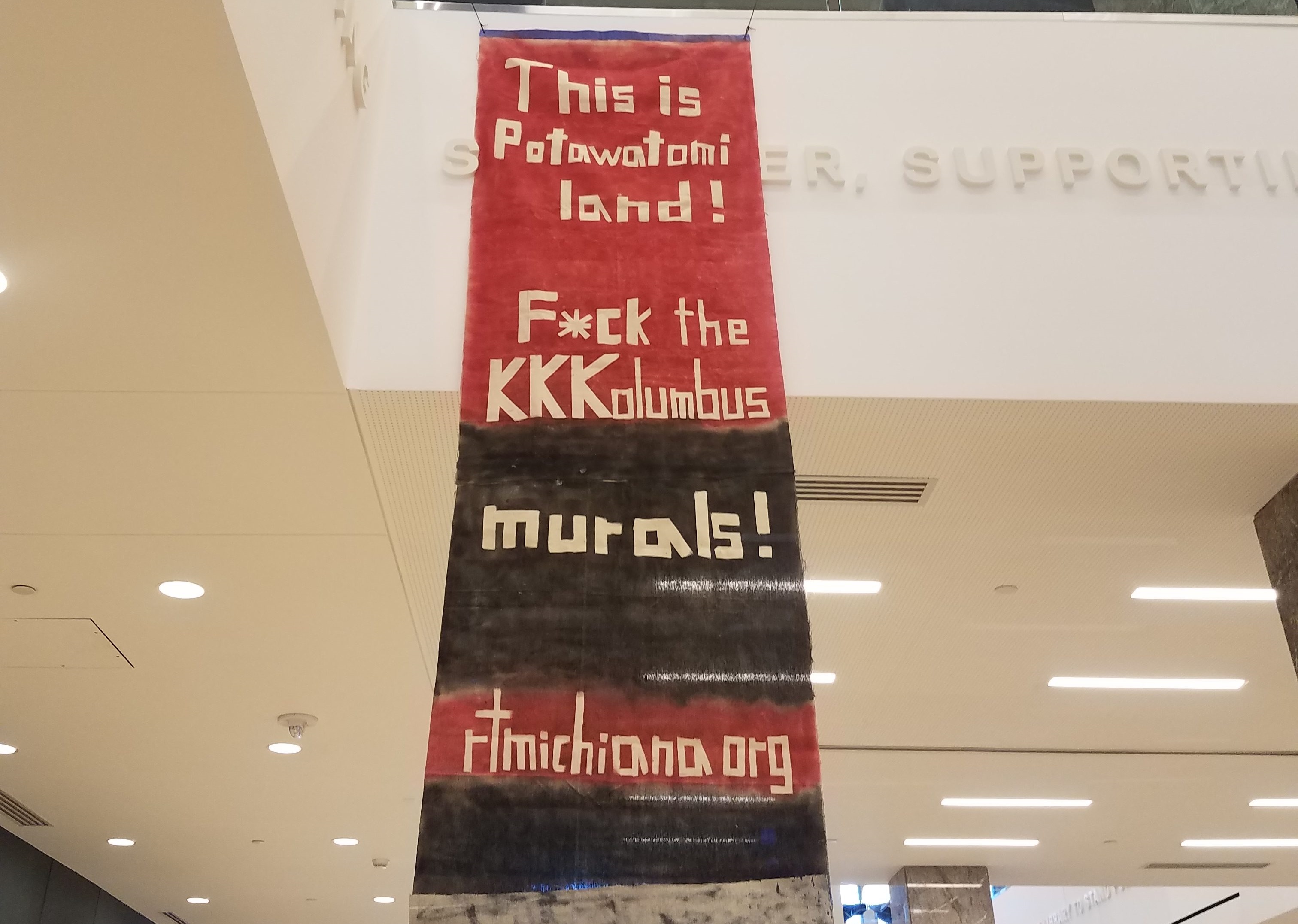 A giant banner — reading, “This is Potawatomi land! F–k the KKKolumbus murals!” — was unfurled inside Notre Dame’s campus library on Friday morning as students were studying for final exams.