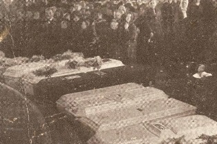 On Dec. 24, 1913, striking mine workers gathered with their families for a Christmas party at Italian Hall in Calumet, Mich. A man wearing a pin for a citizens group aligned with the mining companies entered the crowded second-floor room and shouted "Fire!". Frightened partygoers rushed to the exit and tumbled down the stairs, on top of fallen others. Seventy-three people, including about 60 children, were killed. The community scrambled to find enough tiny caskets.
