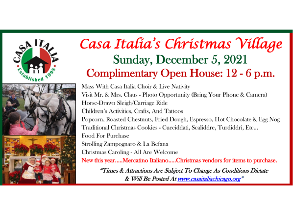 A Christmas Village will once again light up the Casa Italia campus in Stone Park after a one-year hiatus prompted by the pandemic. The complimentary open house is slated for Dec. 5, and more than a dozen organizations have signed up as sponsors.