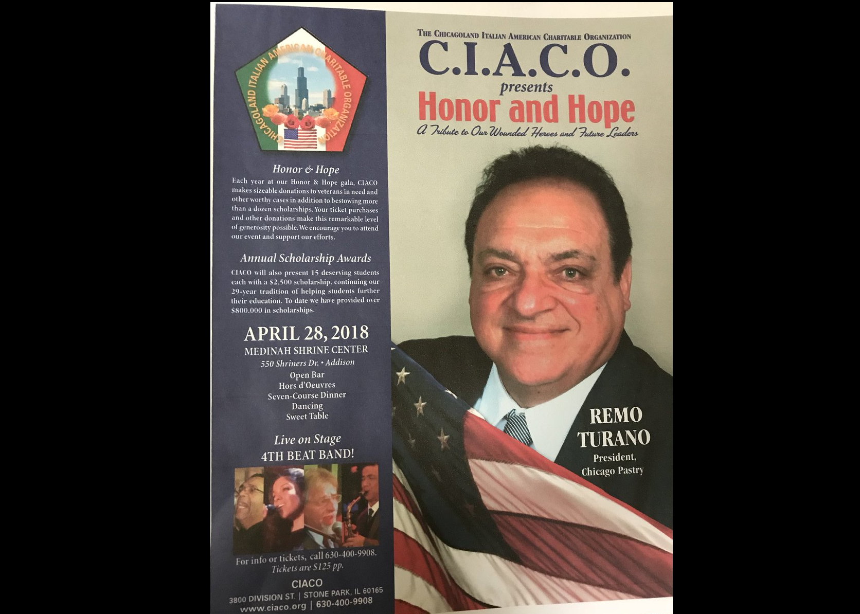 The Chicagoland Italian American Charitable Organization will honor Remo Turano as Humanitarian of the Year at its Honor & Hope Gala on April 28 at the Medinah Shrine Center in Addison. More than a dozen scholarships will be presented at the event, along with donations to a wounded veteran and other worthy causes. To participate, visit http://www.ciaco.org/honor-and-hope-gala/ A profile of Turano follows: