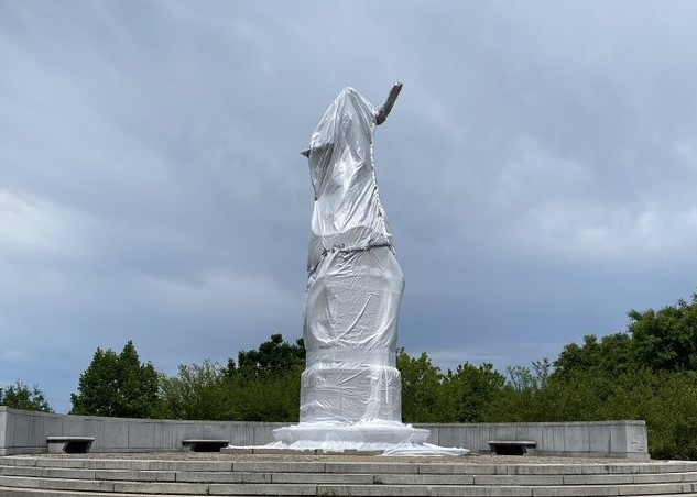 The statues were covered up last Wednesday with the tarps, the Park District said. The district said it is not known how long they will be covered. A week ago Saturday, the Grant Park statue was spray-painted with terms like “BLM” and “genocide” – and in one spot with red paint that was left dripping like blood over the inscription that credits Columbus as the “discoverer of America.”