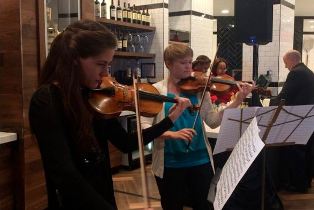 With a ceremonious wave of a conductor's baton by Hard Rock Rocksino President Mark Birtha, two Cleveland Institute of Music students Sara Page and Leah Latorraca played the third movement of Bach's Concerto for Violins in D minor to mark the June 15 opening of the newest eatery at the Rocksino, Concerto.