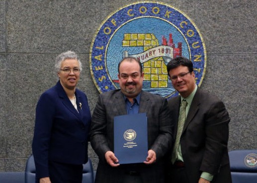 Cook County Board President Toni Preckwinkle and County Commissioner Peter Silvestri recently presented Edward Lezza, Jr. with a resolution honoring the 113-year history of Lezza Spumoni & Desserts. The resolution reads: