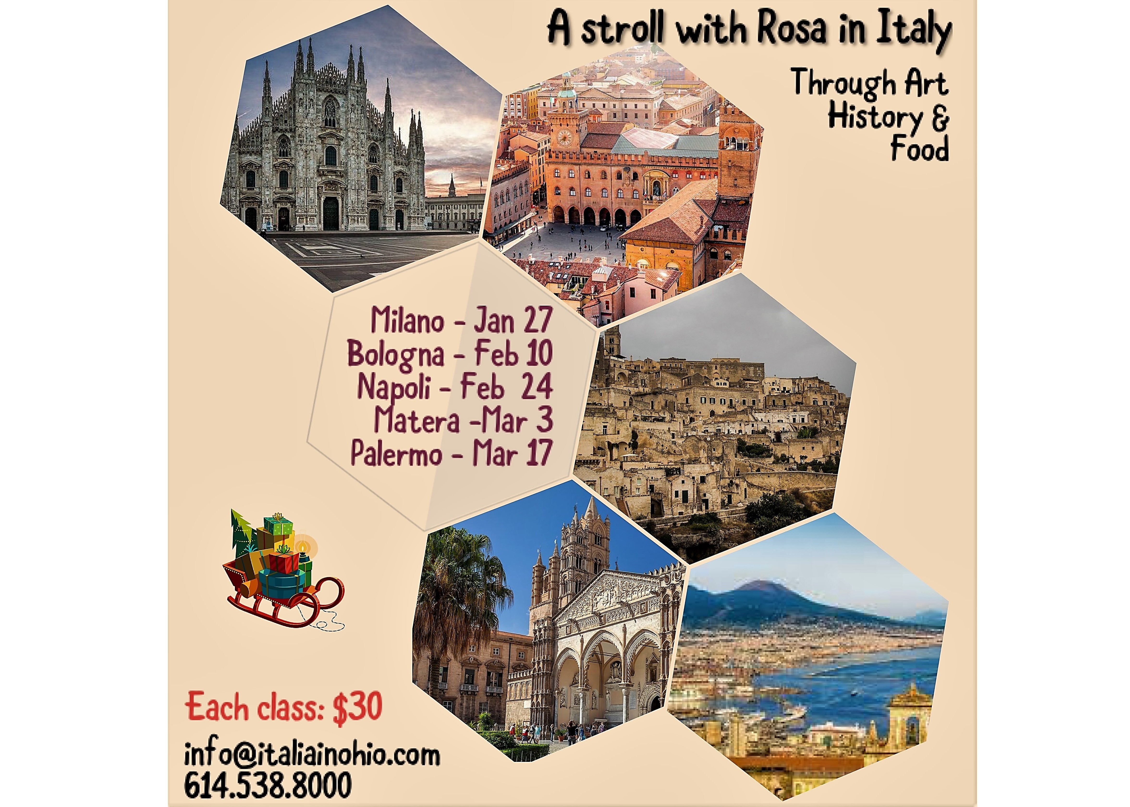 What better way to spend a grey winter’s afternoon that a virtual tour of Italy? Starting in January our art scholar Rosa Di Grottole will present classes featuring new Italian cities to discover. Each day a different city and a different aspect of Italian culture. The presentations will be on the art, food and culture of Milano, Bologna, Napoli, Matera and Palermo.