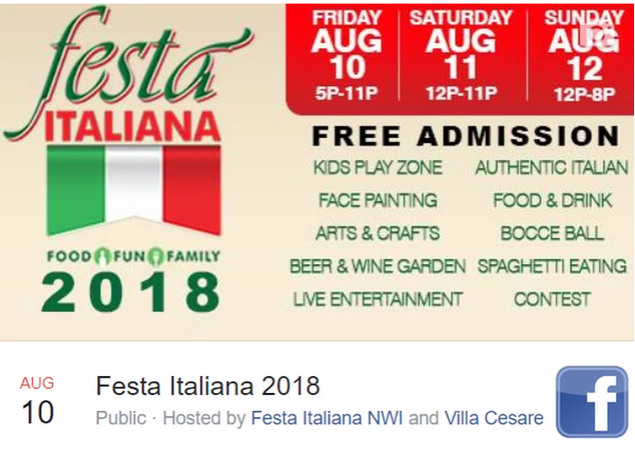 Cesare Battisti Lodge #27 will host the ethnic festival from 5 p.m. to 11 p.m. Friday, August 10th, noon to 11 p.m. Saturday, August 11th and noon to 8 p.m. Sunday, August 12th at Villa Cesare, 900 Eagle Ridge Dr. in Schererville.