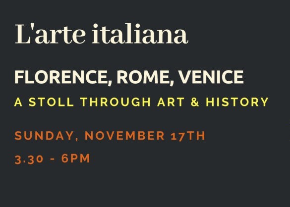 A stroll through the art history of Florence, Rome, and Venice. Come along with noted art scholar Rosa Di Grottole as she guides us through the streets and galleries of these cities, filled with classic art. Sunday afternoon 17 November.