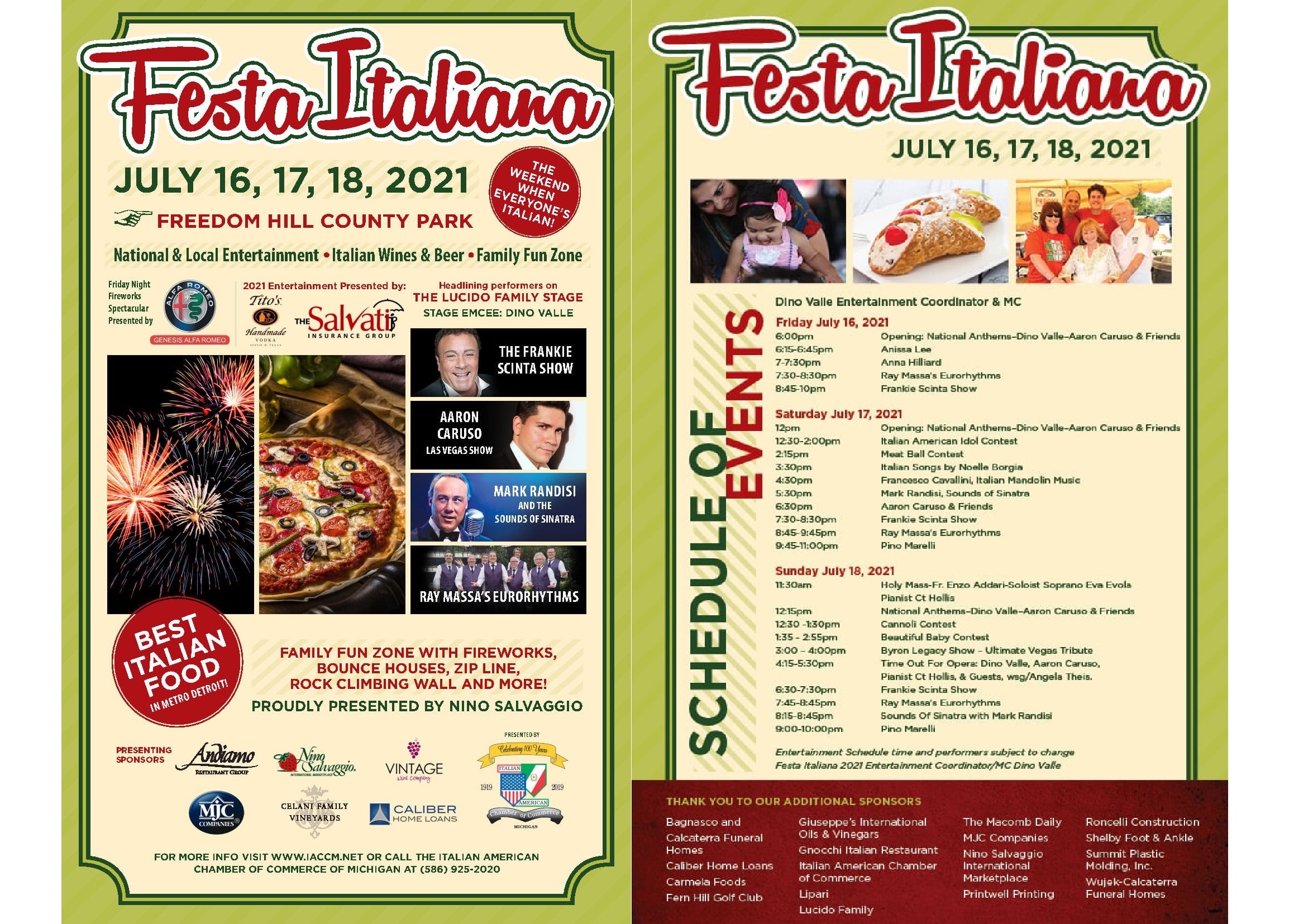 The Italian American Chamber of Commerce of Michigan is proud to announce that Festa Italiana is back bigger and better than ever. The event will take place on July 16, 17, and 18, 2021 at Freedom Hill County Park in Sterling Heights. There will be plenty of great food, drinks and continuous live entertainment on the Lucido Family Stage, in addition to our popular contests.