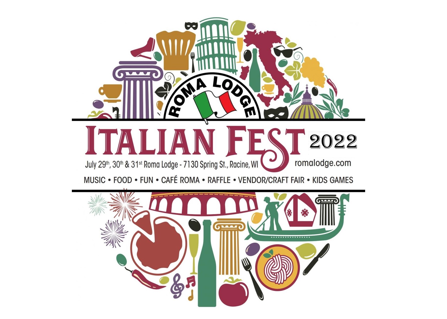 The 43rd annual Roma Lodge Italian Festival will be held Friday through Sunday, July 29-31, on the Roma Lodge grounds, 7130 Spring St. Food will include meatball, beef and sausage Italian sandwiches, pizza, mostaccioli, tomato salad, fried snacks, corn-on-the-cob, bakery, fried dough, cannoli and other foods prepared by the Roma Lodge and Vittoria Colonna Lodge. Sit-down dinners are available with different menus Friday through Sunday.