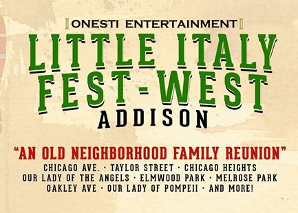 August 2 5PM to August 5 9PM CDT. Onesti's Little Italy Fest-West in Addison - Centennial Park on Lake Street at Route 53, Addison (Illinois) 60101. Buy tickets here. The smell of garlic and the sounds of Sinatra, Prima and Valli will once again fill the air of Centennial Park (Lake Street at Rohlwing Road) as the Annual Little Italy Fest-West returns to Addison.