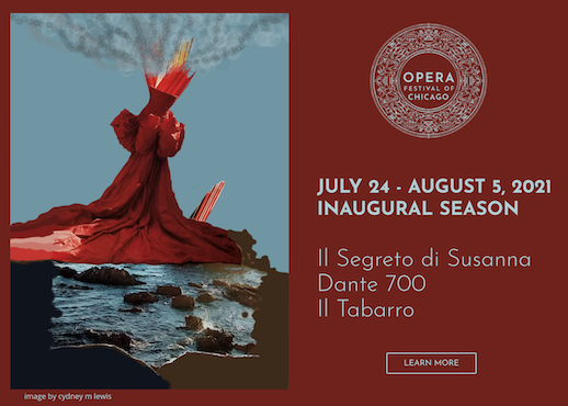 The festival opens with performances of Ermanno Wolf-Ferrari’s whimsical one-act opera, “Il segreto di Susanna” (Susanna’s Secret), at 7 and 9 p.m. on July 24 at the Athenaeum Theatre in Chicago. “Dante 700” will be presented “Dante 700” at 8 p.m. on July 28 and 29 at Artifact Events in Chicago. The program will celebrate impact of Dante and his “Divine Comedy” on the operatic repertoire.