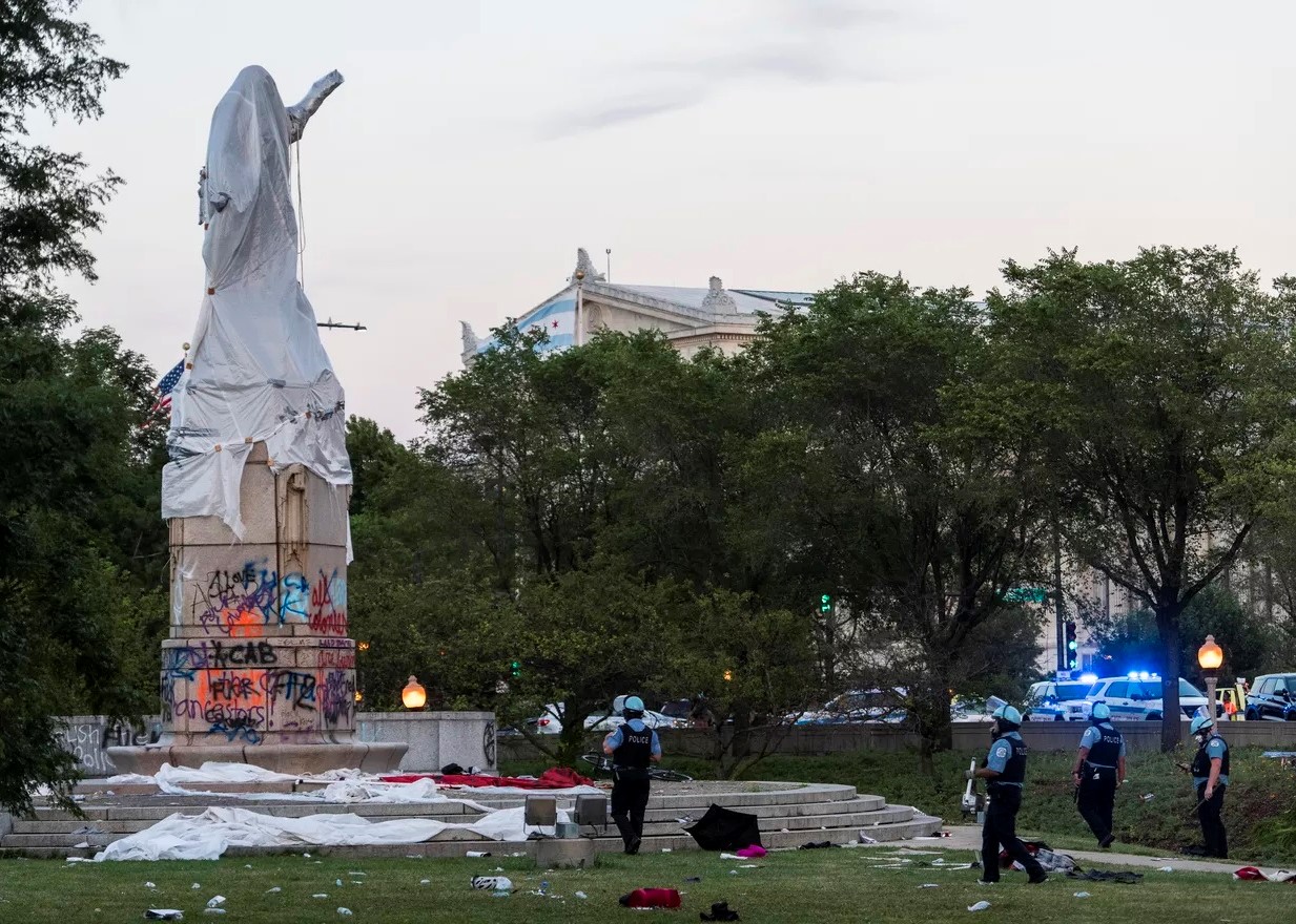 Protesters dispersed by police after trying to topple Columbus statue in Grant Park