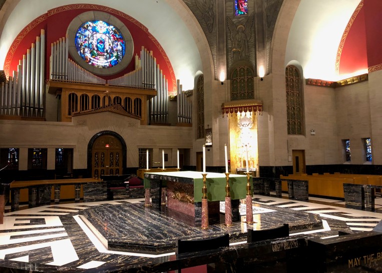 Nestled behind — the building actually wraps around it — and sharing the same address is the National Shrine of Saint Frances Xavier Cabrini. It’s the former chapel of Columbus Hospital, shuttered in 2001; when the 3-acre hospital site was sold to developers, the stipulation was the shrine would be preserved.